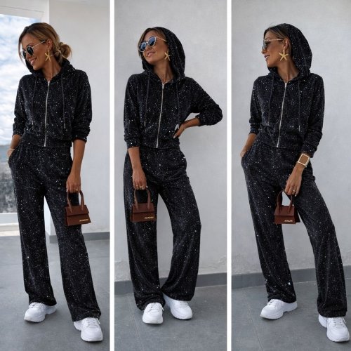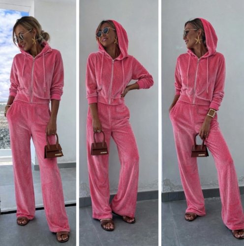 Kadın uzun kollu kapşonlu önden fermuarlı viskon iki iplik bluz ve pantolon ikili takım